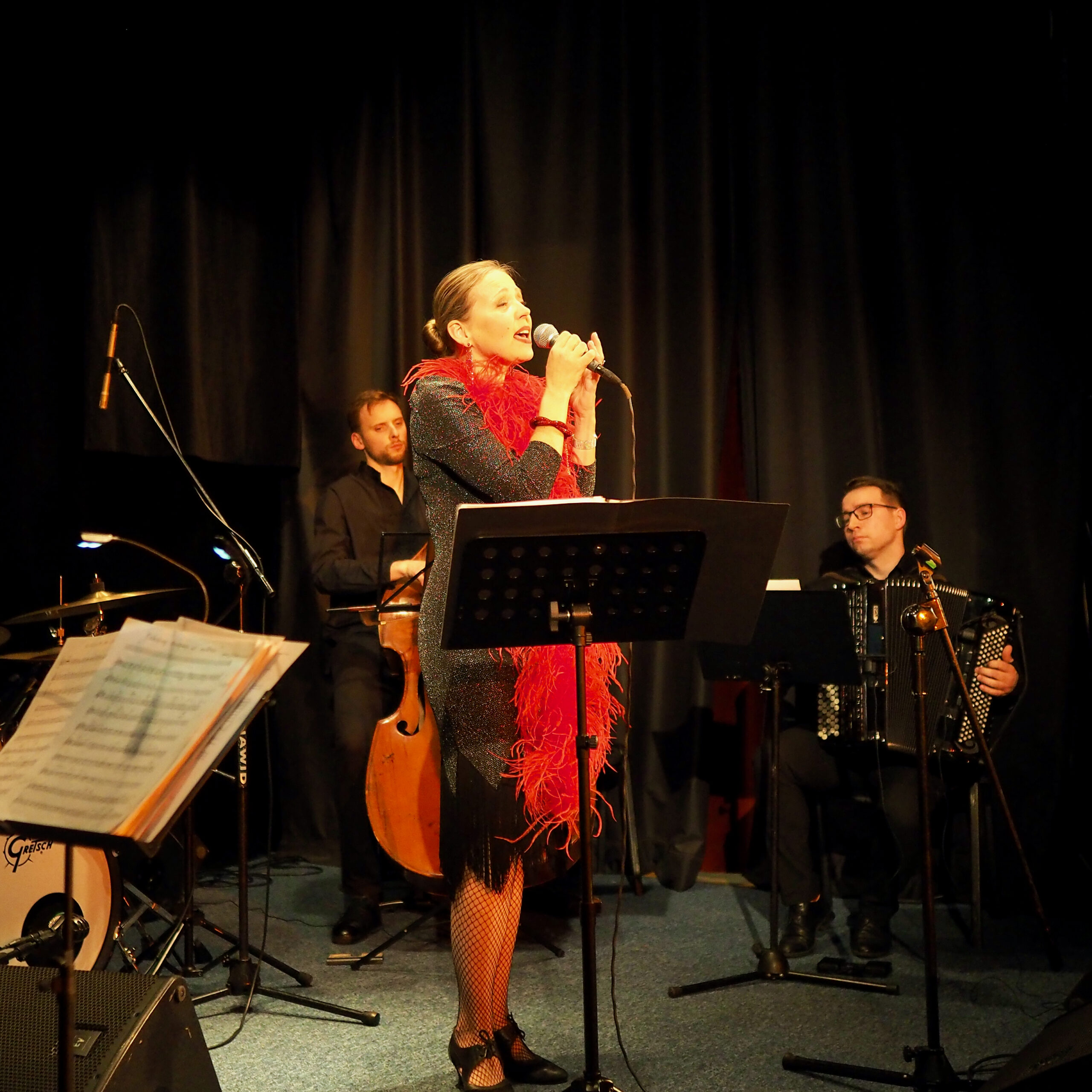 Na scenie śpiewa wokalistka, w tle kontrabasista i akordeonista